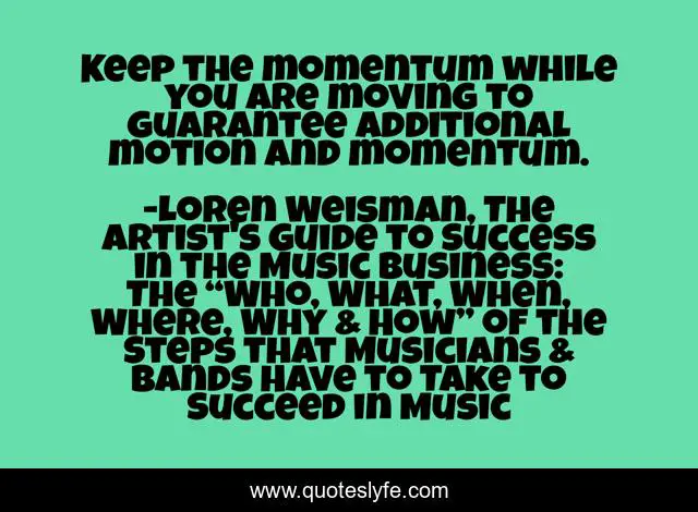 "Loren Weisman, The Artist's Guide to Success in the Music Business: The “Who, What, When, Where, Why & How” of the Steps that Musicians & Bands Have to Take to Succeed in Music Quotes." Quoteslyfe.com, 2025. Fri. 05 Dec. 2025. <https://www.quoteslyfe.com/quote/Keep-the-momentum-while-you-are-moving-32510>.