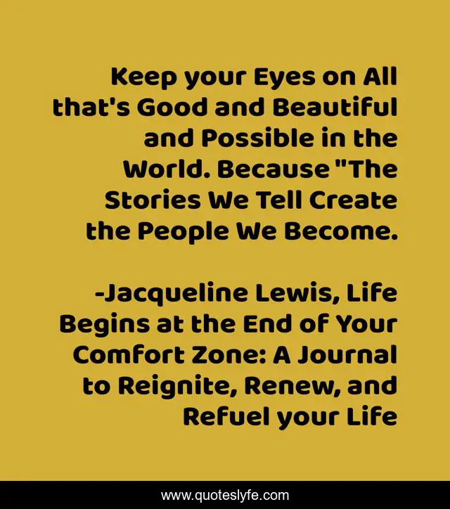 This page presents the quote "Keep your Eyes on All that's Good and Beautiful and Possible in the World. Because "The Stories We Tell Create the People We Become.". Author of this quote is Jacqueline Lewis, Life Begins at the End of Your Comfort Zone: A Journal to Reignite, Renew, and Refuel your Life. This quote is about gratitude, enthusiasm, inspirational, positive-thinking,.