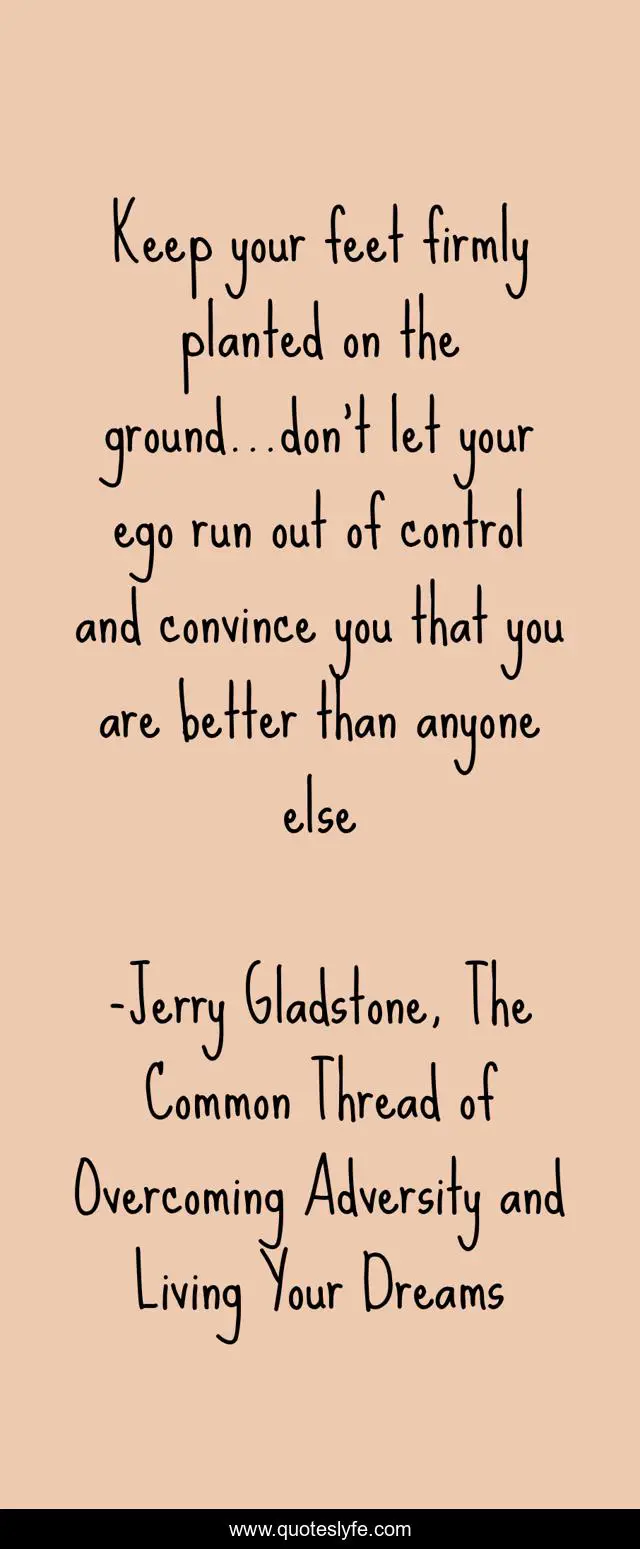 This page presents the quote "Keep your feet firmly planted on the ground...don't let your ego run out of control and convince you that you are better than anyone else". Author of this quote is Jerry Gladstone, The Common Thread of Overcoming Adversity and Living Your Dreams. This quote is about confidence, humble, life-lessons, grounded, positive, motivational, jerry-gladstone, ego, optimistic,.