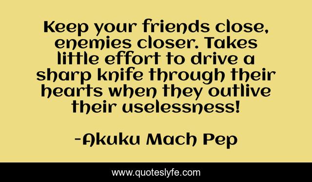 This page presents the quote "Keep your friends close, enemies closer. Takes little effort to drive a sharp knife through their hearts when they outlive their uselessness!". Author of this quote is Akuku Mach Pep. This quote is about closer, heart, drive, close, friends, enemies,.