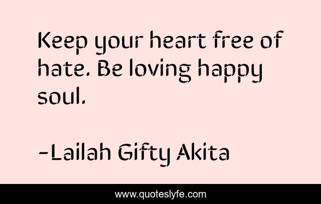 This page presents the quote "Keep your heart free of hate. Be loving happy soul.". Author of this quote is Lailah Gifty Akita. This quote is about wise-words, love, soul, wisdom-of-lailah-gifty-akita, hate, affection,.