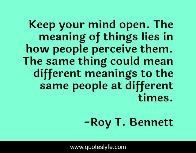 This page presents the quote "Keep your mind open. The meaning of things lies in how people perceive them. The same thing could mean different meanings to the same people at different times.". Author of this quote is Roy T. Bennett. This quote is about living, inspiring, inspire, positive, positive-affirmation, mind, confidence, optimism, positive-thinking,.