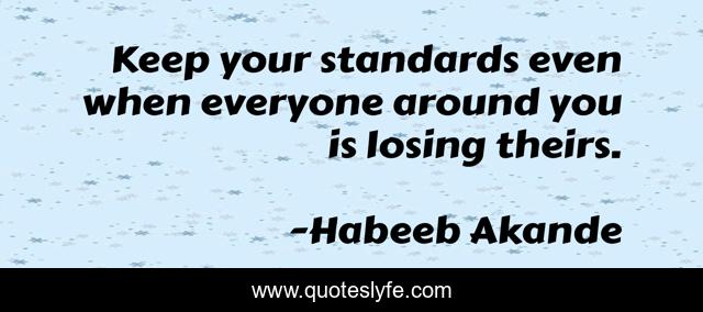 This page presents the quote "Keep your standards even when everyone around you is losing theirs.". Author of this quote is Habeeb Akande. This quote is about desire, confidence, success, aim-high, positive, motivational, drive, expectations, determination,.