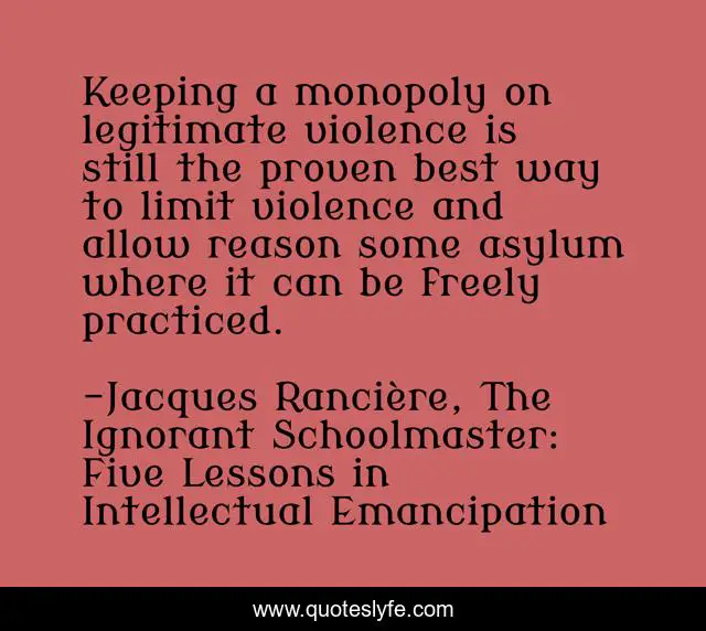 "Jacques Rancière, The Ignorant Schoolmaster: Five Lessons in Intellectual Emancipation Quotes." Quoteslyfe.com, 2025. Sat. 06 Dec. 2025. <https://www.quoteslyfe.com/quote/Keeping-a-monopoly-on-legitimate-violence-is-174239>.