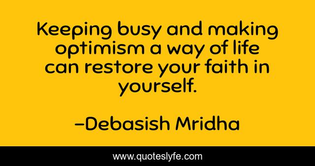This page presents the quote "Keeping busy and making optimism a way of life can restore your faith in yourself.". Author of this quote is Debasish Mridha. This quote is about life, love, knowledge, inspirational, intelligence, philosophy, wisdom, quotes, affection,.
