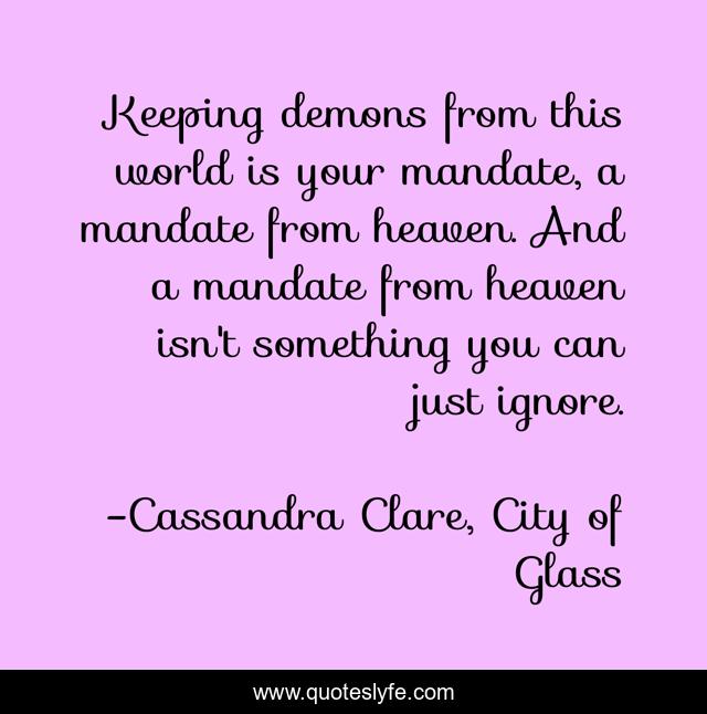 This page presents the quote "Keeping demons from this world is your mandate, a mandate from heaven. And a mandate from heaven isn't something you can just ignore.". Author of this quote is Cassandra Clare, City of Glass. This quote is about enthusiasm, clary-fray, speech, inspirational,.