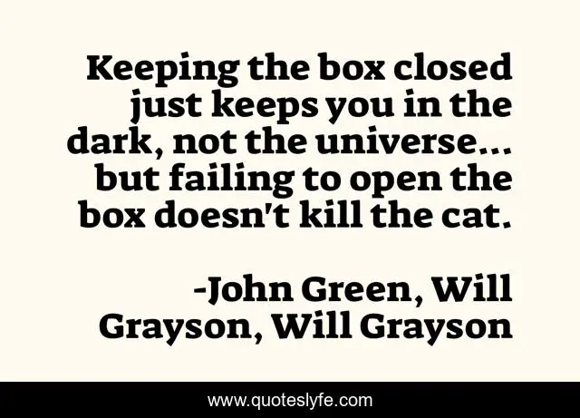 This page presents the quote "Keeping the box closed just keeps you in the dark, not the universe... but failing to open the box doesn't kill the cat.". Author of this quote is John Green, Will Grayson, Will Grayson. This quote is about romance, science,.