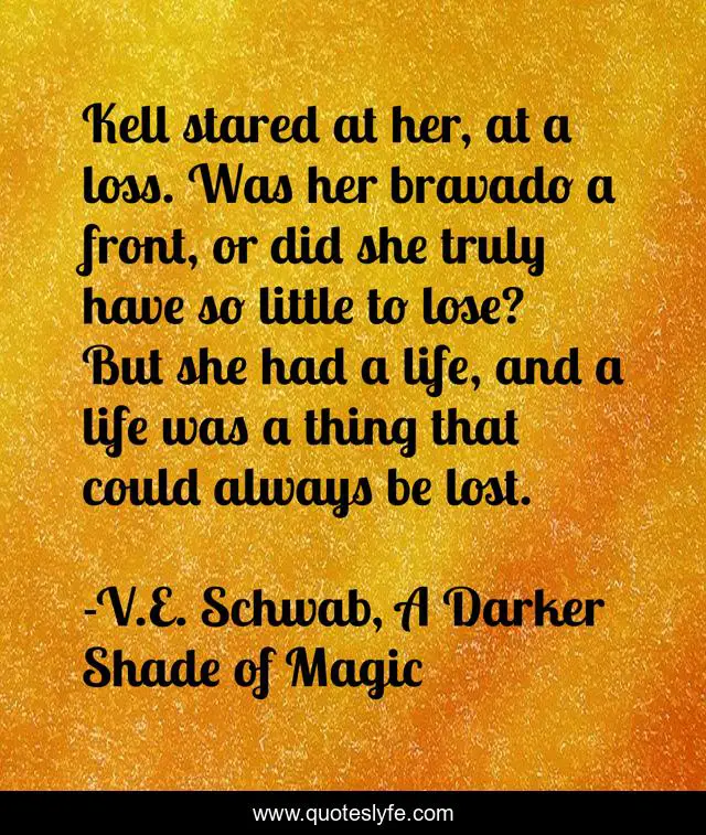 This page presents the quote "Kell stared at her, at a loss. Was her bravado a front, or did she truly have so little to lose? But she had a life, and a life was a thing that could always be lost.". Author of this quote is V.E. Schwab, A Darker Shade of Magic. This quote is about loss, life, death,.