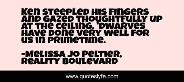 This page presents the quote "Ken steepled his fingers and gazed thoughtfully up at the ceiling. 'Dwarves have done very well for us in primetime.". Author of this quote is Melissa Jo Peltier, Reality Boulevard. This quote is about hollywood, dwarves, satire,.
