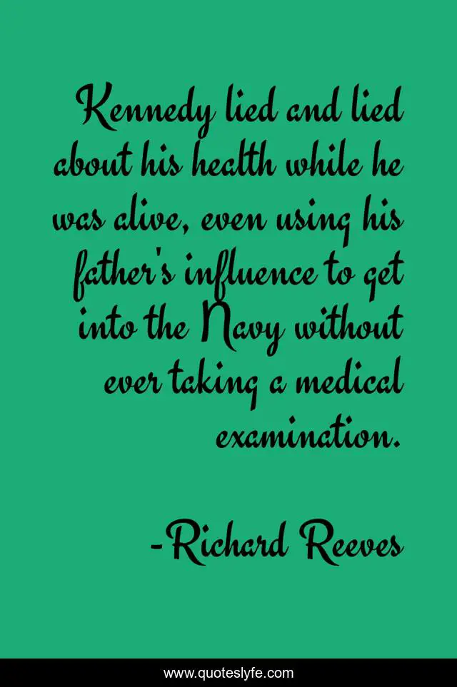 This page presents the quote "Kennedy lied and lied about his health while he was alive, even using his father's influence to get into the Navy without ever taking a medical examination.". Author of this quote is Richard Reeves. This quote is about influence, health, father,.