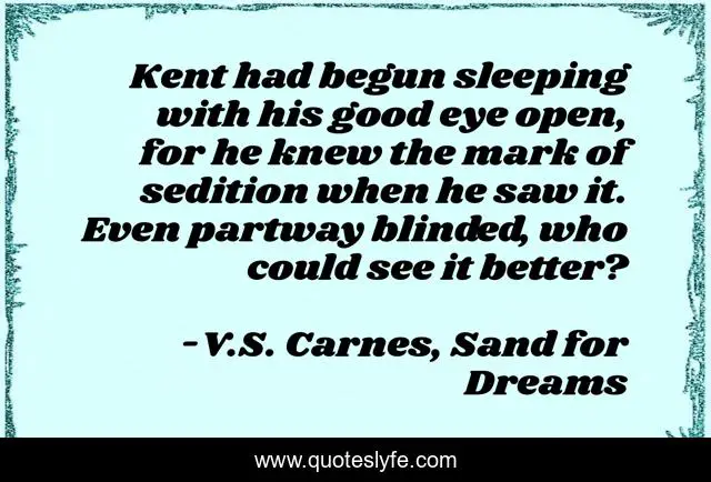 This page presents the quote "Kent had begun sleeping with his good eye open, for he knew the mark of sedition when he saw it. Even partway blinded, who could see it better?". Author of this quote is V.S. Carnes, Sand for Dreams. This quote is about romance, christian,.