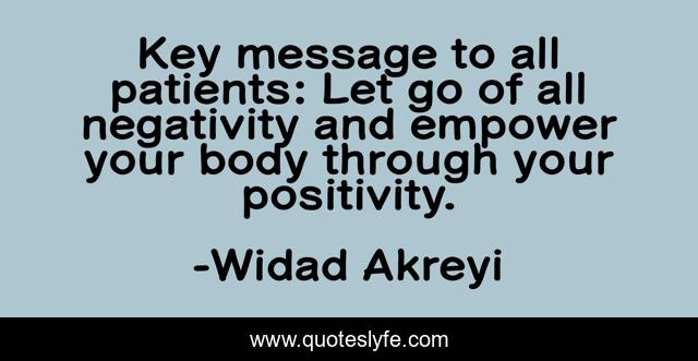 This page presents the quote "Key message to all patients: Let go of all negativity and empower your body through your positivity.". Author of this quote is Widad Akreyi. This quote is about enthusiasm, patients, positivity, inspirational,.