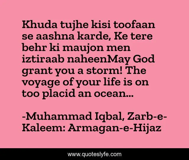 "Muhammad Iqbal, Zarb-e-Kaleem: Armagan-e-Hijaz Quotes." Quoteslyfe.com, 2025. Fri. 05 Dec. 2025. <https://www.quoteslyfe.com/quote/Khuda-tujhe-kisi-toofaan-se-aashna-karde-141589>.