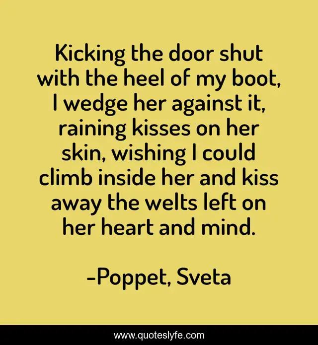 This page presents the quote "Kicking the door shut with the heel of my boot, I wedge her against it, raining kisses on her skin, wishing I could climb inside her and kiss away the welts left on her heart and mind.". Author of this quote is Poppet, Sveta. This quote is about paranormal-romance, vampire-romance,.
