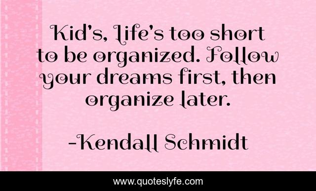 This page presents the quote "Kid's, Life's too short to be organized. Follow your dreams first, then organize later.". Author of this quote is Kendall Schmidt. .