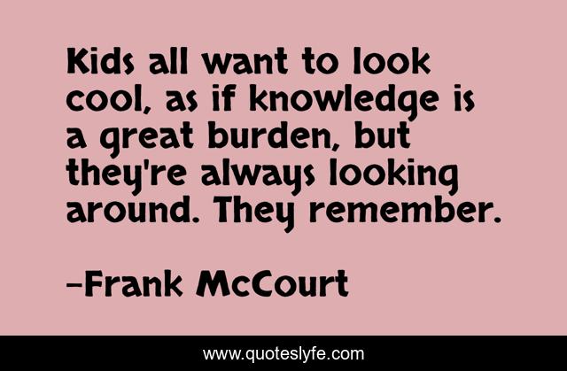 This page presents the quote "Kids all want to look cool, as if knowledge is a great burden, but they're always looking around. They remember.". Author of this quote is Frank McCourt. This quote is about great, knowledge, remember,.