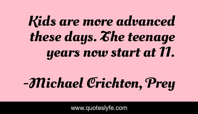 This page presents the quote "Kids are more advanced these days. The teenage years now start at 11.". Author of this quote is Michael Crichton, Prey. This quote is about teens, kids, teenagers,.