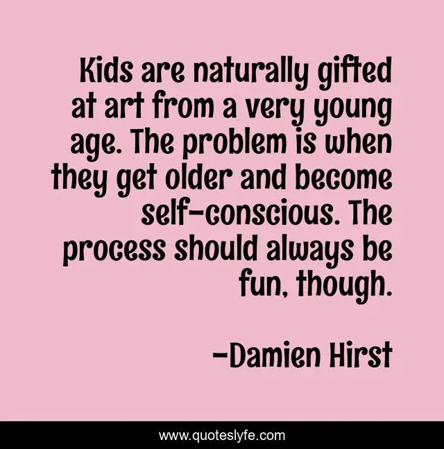 This page presents the quote "Kids are naturally gifted at art from a very young age. The problem is when they get older and become self-conscious. The process should always be fun, though.". Author of this quote is Damien Hirst. This quote is about fun, problem, art,.