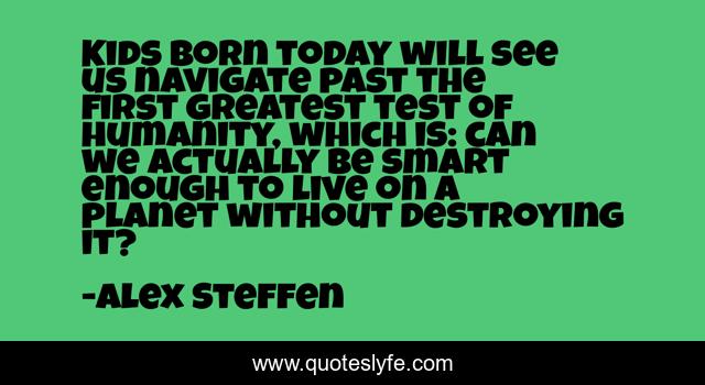 This page presents the quote "Kids born today will see us navigate past the first greatest test of humanity, which is: can we actually be smart enough to live on a planet without destroying it?". Author of this quote is Alex Steffen. This quote is about sustainability, future, mankind, planet-earth, earth, humanity, resources, history,.