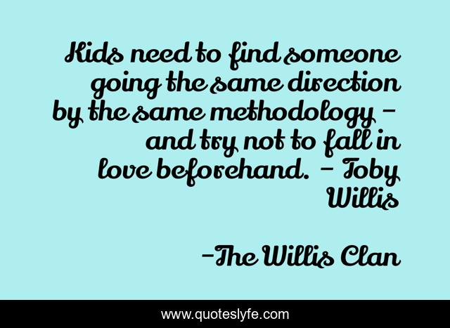 This page presents the quote "Kids need to find someone going the same direction by the same methodology – and try not to fall in love beforehand. – Toby Willis". Author of this quote is The Willis Clan. This quote is about parenthood, emotions, romance, infatuation, dating, goal-setting,.