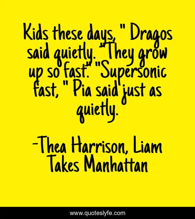 This page presents the quote "Kids these days, " Dragos said quietly. "They grow up so fast." "Supersonic fast, " Pia said just as quietly.". Author of this quote is Thea Harrison, Liam Takes Manhattan. This quote is about goddesses, elder-races, paranormal, growing-pains, dragons, puppies,.