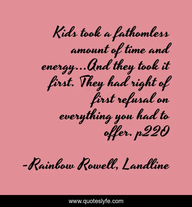 This page presents the quote "Kids took a fathomless amount of time and energy...And they took it first. They had right of first refusal on everything you had to offer. p220". Author of this quote is Rainbow Rowell, Landline. .