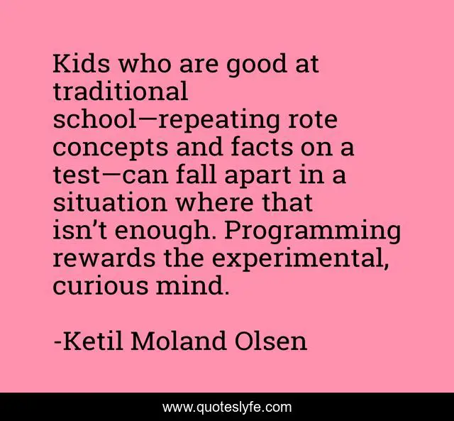 This page presents the quote "Kids who are good at traditional school—repeating rote concepts and facts on a test—can fall apart in a situation where that isn’t enough. Programming rewards the experimental, curious mind.". Author of this quote is Ketil Moland Olsen. This quote is about school, programming, children, learning,.