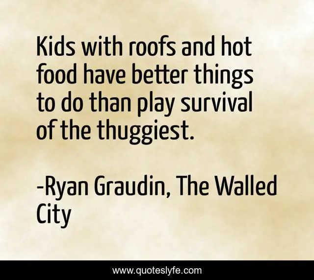 This page presents the quote "Kids with roofs and hot food have better things to do than play survival of the thuggiest.". Author of this quote is Ryan Graudin, The Walled City. This quote is about the-walled-city, japan, ya,.