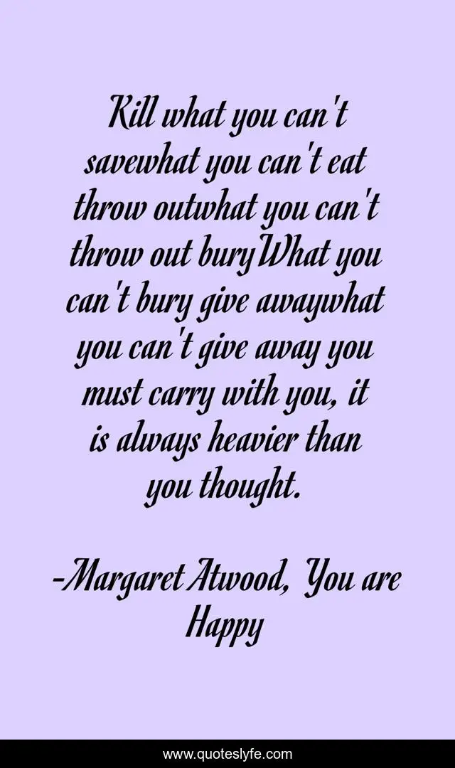 This page presents the quote "Kill what you can't savewhat you can't eat throw outwhat you can't throw out buryWhat you can't bury give awaywhat you can't give away you must carry with you, it is always heavier than you thought.". Author of this quote is Margaret Atwood, You are Happy. This quote is about burden, poetry, weight,.