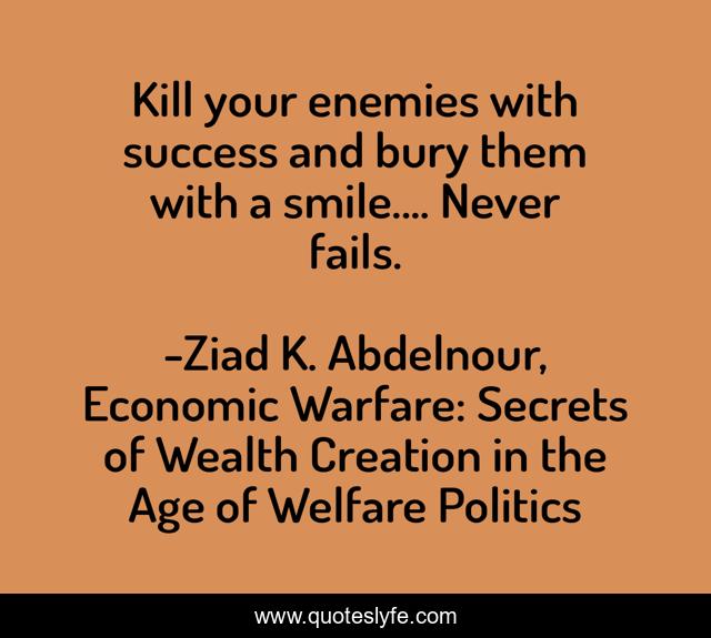 This page presents the quote "Kill your enemies with success and bury them with a smile.... Never fails.". Author of this quote is Ziad K. Abdelnour, Economic Warfare: Secrets of Wealth Creation in the Age of Welfare Politics. This quote is about smile, success, happiness, enemies,.