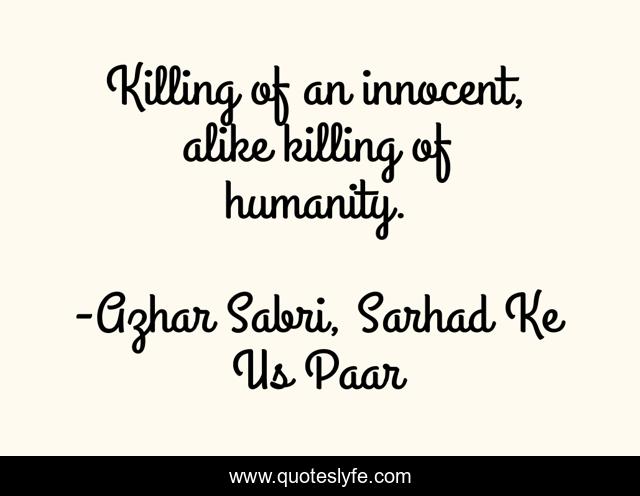 This page presents the quote "Killing of an innocent, alike killing of humanity.". Author of this quote is Azhar Sabri, Sarhad Ke Us Paar. This quote is about enthusiasm, life-and-living, inspirational,.