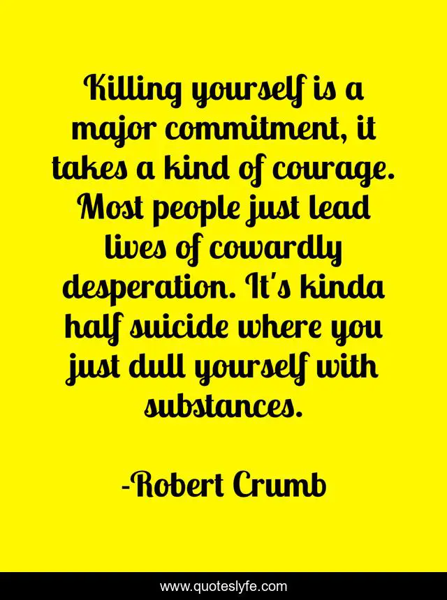 This page presents the quote "Killing yourself is a major commitment, it takes a kind of courage. Most people just lead lives of cowardly desperation. It's kinda half suicide where you just dull yourself with substances.". Author of this quote is Robert Crumb. This quote is about yourself, commitment, people,.