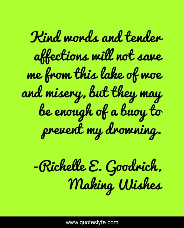 This page presents the quote "Kind words and tender affections will not save me from this lake of woe and misery, but they may be enough of a buoy to prevent my drowning.". Author of this quote is Richelle E. Goodrich, Making Wishes. This quote is about kindness, help, richelle-e-goodrich, kind-words, charity, richelle, helping-others, richelle-goodrich, save,.