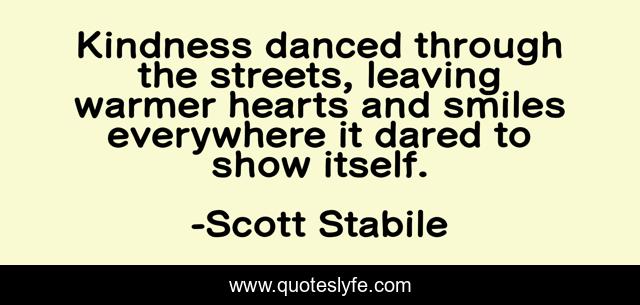 This page presents the quote "Kindness danced through the streets, leaving warmer hearts and smiles everywhere it dared to show itself.". Author of this quote is Scott Stabile. This quote is about kindness, love, affection,.