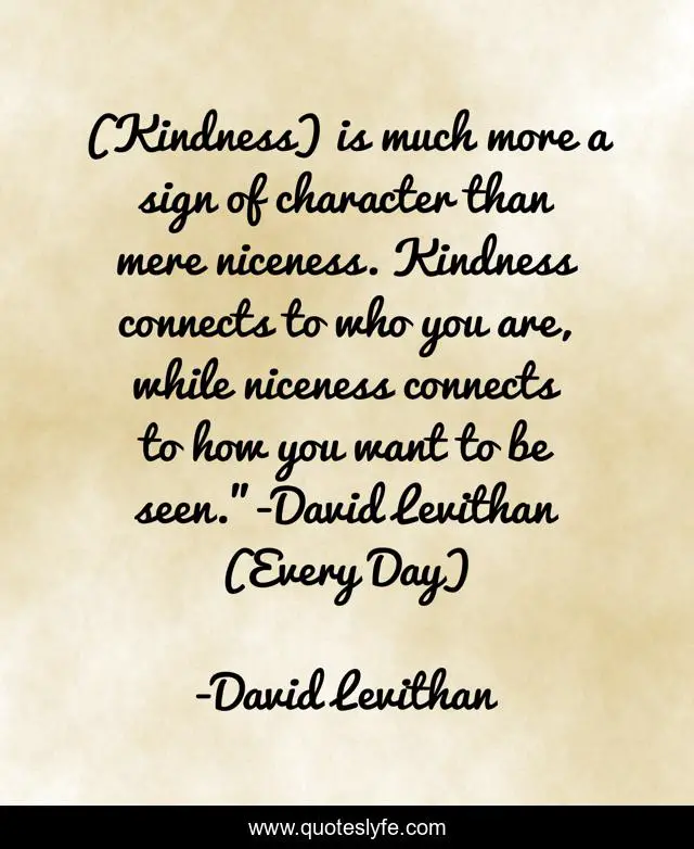 This page presents the quote "(Kindness) is much more a sign of character than mere niceness. Kindness connects to who you are, while niceness connects to how you want to be seen."-David Levithan (Every Day)". Author of this quote is David Levithan. .