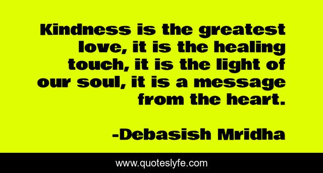 This page presents the quote "Kindness is the greatest love, it is the healing touch, it is the light of our soul, it is a message from the heart.". Author of this quote is Debasish Mridha. This quote is about life, love, knowledge, inspirational, intelligence, philosophy, wisdom, quotes, affection,.