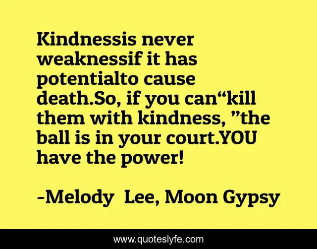 This page presents the quote "Kindnessis never weaknessif it has potentialto cause death.So, if you can“kill them with kindness, ”the ball is in your court.YOU have the power!". Author of this quote is Melody Lee, Moon Gypsy. This quote is about death, love, power, compassion, kindness, affection,.