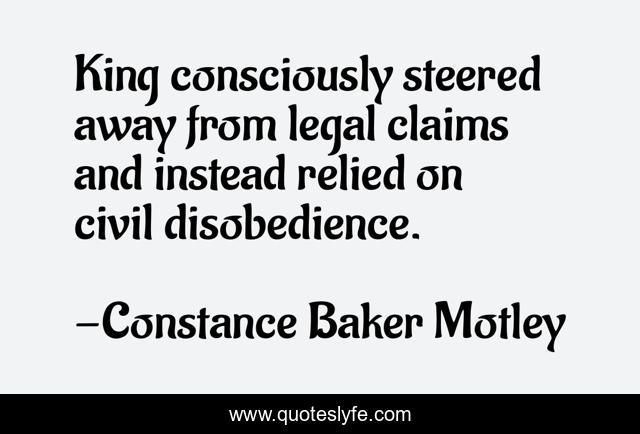 This page presents the quote "King consciously steered away from legal claims and instead relied on civil disobedience.". Author of this quote is Constance Baker Motley. This quote is about king, away, disobedience,.