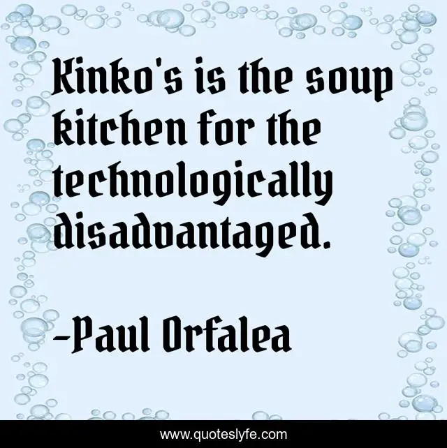 This page presents the quote "Kinko's is the soup kitchen for the technologically disadvantaged.". Author of this quote is Paul Orfalea. This quote is about kinko-s, technology, paul-orfalea,.