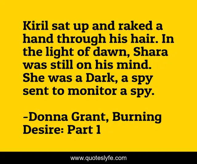 This page presents the quote "Kiril sat up and raked a hand through his hair. In the light of dawn, Shara was still on his mind. She was a Dark, a spy sent to monitor a spy.". Author of this quote is Donna Grant, Burning Desire: Part 1. This quote is about paranormal-romance, dragons,.