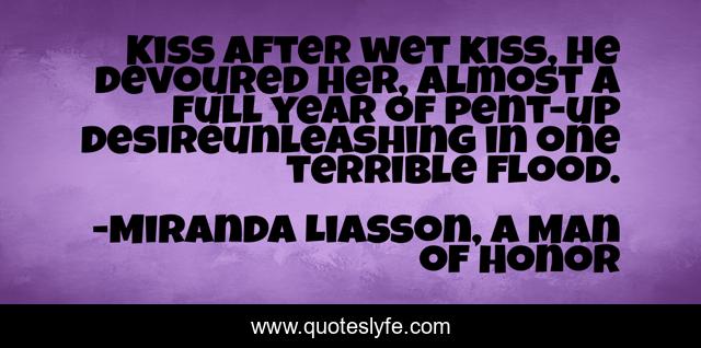 This page presents the quote "Kiss after wet kiss, he devoured her, almost a full year of pent-up desireunleashing in one terrible flood.". Author of this quote is Miranda Liasson, A Man of Honor. This quote is about romance, war-hero, contemporary,.