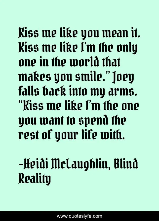 This page presents the quote "Kiss me like you mean it. Kiss me like I’m the only one in the world that makes you smile.” Joey falls back into my arms. “Kiss me like I’m the one you want to spend the rest of your life with.". Author of this quote is Heidi McLaughlin, Blind Reality. .