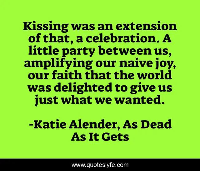 This page presents the quote "Kissing was an extension of that, a celebration. A little party between us, amplifying our naive joy, our faith that the world was delighted to give us just what we wanted.". Author of this quote is Katie Alender, As Dead As It Gets. This quote is about kissing, passion,.