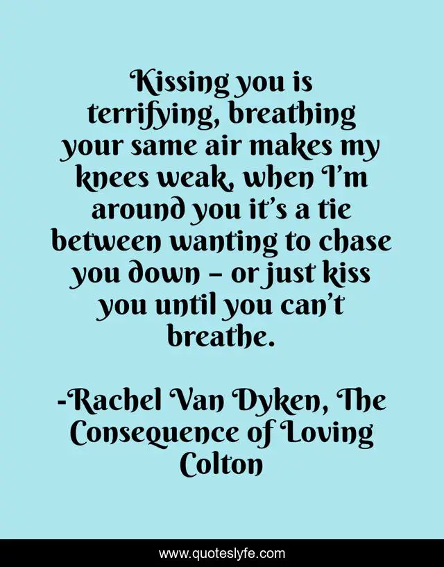This page presents the quote "Kissing you is terrifying, breathing your same air makes my knees weak, when I’m around you it’s a tie between wanting to chase you down – or just kiss you until you can’t breathe.". Author of this quote is Rachel Van Dyken, The Consequence of Loving Colton. This quote is about breathe, sweet, kiss,.