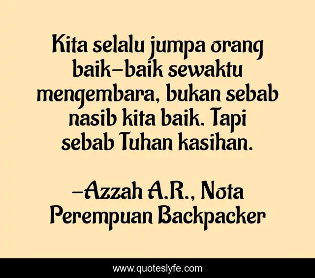 This page presents the quote "Kita selalu jumpa orang baik-baik sewaktu mengembara, bukan sebab nasib kita baik. Tapi sebab Tuhan kasihan.". Author of this quote is Azzah A.R., Nota Perempuan Backpacker. This quote is about enthusiasm, travel, inspirational,.