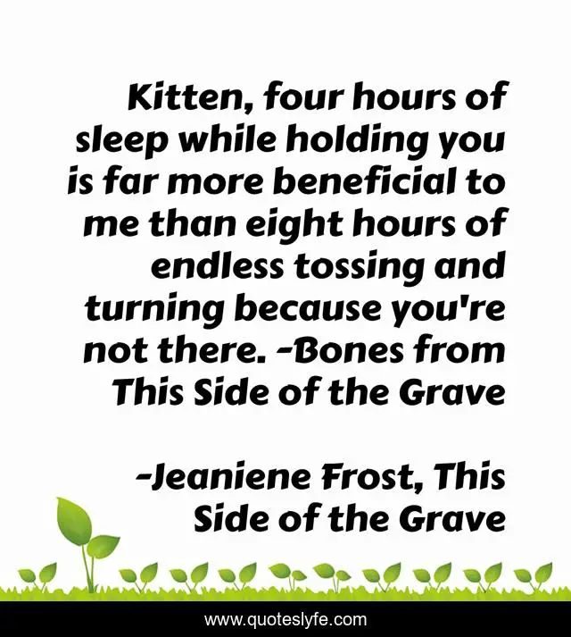 This page presents the quote "Kitten, four hours of sleep while holding you is far more beneficial to me than eight hours of endless tossing and turning because you're not there. -Bones from This Side of the Grave". Author of this quote is Jeaniene Frost, This Side of the Grave. .