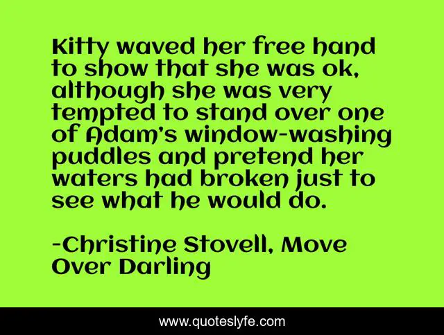 This page presents the quote "Kitty waved her free hand to show that she was ok, although she was very tempted to stand over one of Adam’s window-washing puddles and pretend her waters had broken just to see what he would do.". Author of this quote is Christine Stovell, Move Over Darling. This quote is about romantic-comedy, contemporary-romance,.