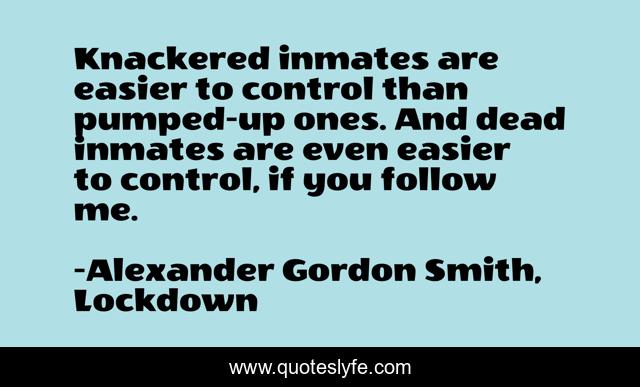 This page presents the quote "Knackered inmates are easier to control than pumped-up ones. And dead inmates are even easier to control, if you follow me.". Author of this quote is Alexander Gordon Smith, Lockdown. This quote is about death, humor,.