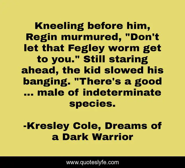 This page presents the quote "Kneeling before him, Regin murmured, "Don't let that Fegley worm get to you." Still staring ahead, the kid slowed his banging. "There's a good ... male of indeterminate species.". Author of this quote is Kresley Cole, Dreams of a Dark Warrior. This quote is about valkyrie, kresley-cole, regin-the-radiant, dreams-of-a-dark-warrior, thad, lore, berserker, immortals-after-dark, paranormal-romance,.