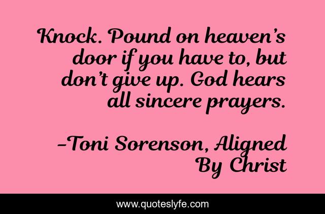 This page presents the quote "Knock. Pound on heaven’s door if you have to, but don’t give up. God hears all sincere prayers.". Author of this quote is Toni Sorenson, Aligned By Christ. This quote is about life, love, god, prayer, affection, inspiration,.